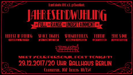 News 29 HIP goes theatre in Norway ![]() 28 Live in Leipzig 2018 27 Konzerttermine ![]() 26 Aus dem Jenseits der Unterhaltung ![]() Rumbalotte Prenzlauer Berg Connection e. V. lädt ein zum Jahresendwuhling mit ausgesuchtem Undertainment im Kielwasser. Die Rumbalotte als schwarzrote Kulturkogge dockt im Ballhaus an mit HERBST IN PEKING & SPACE TIGERS als Headliner und 3 handfesten Supports: FEINDIN/SPIEGELREFLEX/!THE SAME. Bizarre Klänge aus dem Jenseits der Unterhaltung! 25 Eine sozialrevolutionäre Rockestrade ![]() feat. Thor Sten Beckmann & King Snow (electric guitars) 24 Senkblei & Laternenfisch ![]() OUT NOW! CD 13 Euro (incl. Versand) 23 New Video! HERBST IN PEKING - Ich Bin Nichts Alle News: 6 5 4 3 2 1 ![]() |